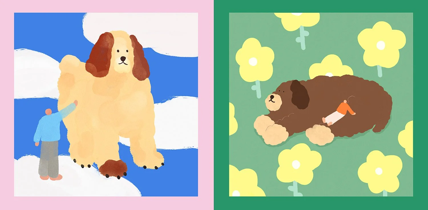 Hana Kim was born and raised in South Korea and now works as a designer in Montreal, Canada. She started painting in 2015, and her art has continued to grow across digital illustration and beyond. Her drawings are inspired by everyday moments, from people to nature to emotions. And, of course, dogs!